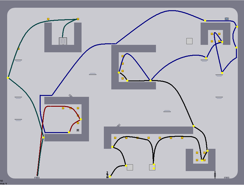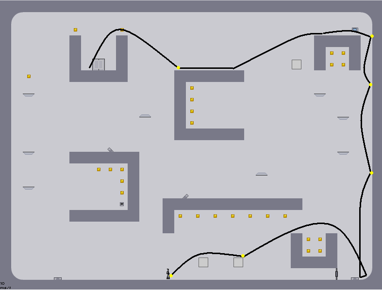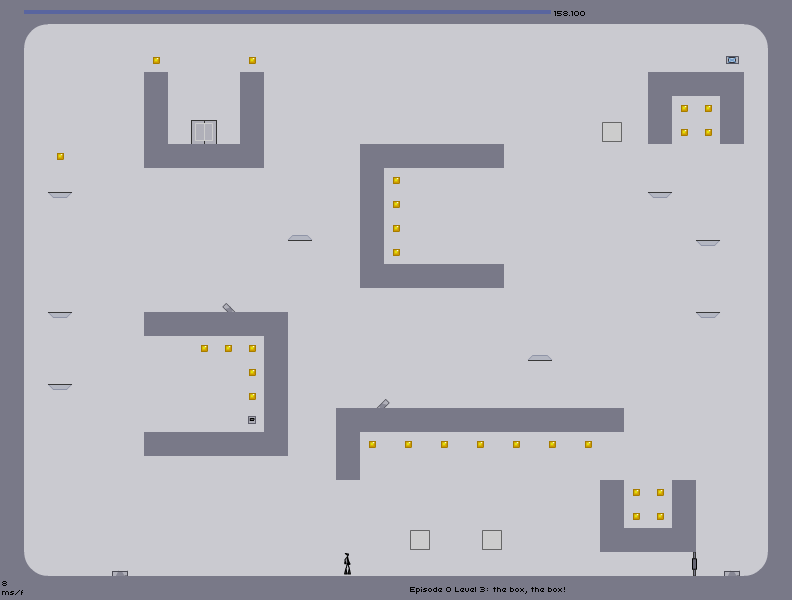 Bounce off the bounceblock onto the gold above you, get the left 4, and land on the second bounceblock. Double jump off of the second bounceblock and get the remaining 3 gold pieces before landing in the box and taking the gold in there. To get out of the box, walljump off of the right side to a corner jump above and to your left (the right edge of the tiles above the initial 7 gold you got). Take your corner jump to the box in the middle of the map that opens to the right and get the 4 gold pieces in the left side. From there, jump to the top of the three one-ways to your right, and continue up into the downward-opening box and collect the 4 gold. Drop down to the middle one-way, and jump right of the box, climbing up to the top of it, getting the exit switch. Run off the left side of that box, dropping onto the top of the middle one. Go off the left of that one as well, dropping onto the next box down. Be sure to clear the angled launchpad as you fall. Skid off the left side of this box (that opens to the left), and drop into it. Get the 5 gold inside, but you can skip the door switch. This next part is tricky for positioning and timing. Drop onto the launchpad on the floor and from there, walljump off of the bottom leg of the box you just left, and head towards the left wall. Grab the single gold above the top one-way before your walljump off the left wall. Off of the wall, get the gold on the left arm of the box containing the exit, and continue on to the last piece of gold without touching that left arm of the box. Once you have that last gold, just drop down into the exit to finish. The fastest-ever time with this route is 119.525 by xaelar.