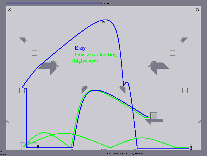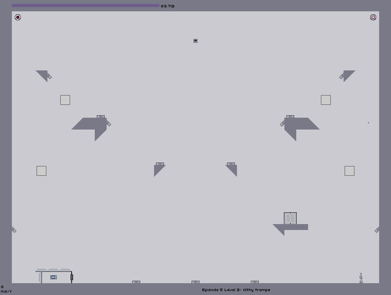 Run left and jump over the first launchpad. Hit the second one and then the one on the left triangle. Get the switch, then continue left through the air to land on the sloped tile to the right. Wallslide, get the switch and bounce to the exit.